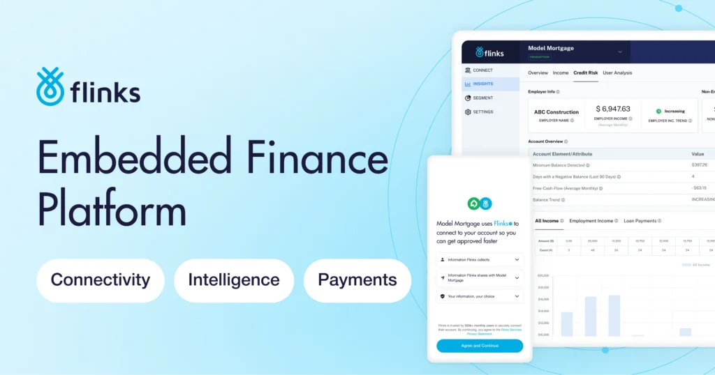 Flinks’ embedded finance platform integrates three proprietary products, creating a comprehensive infrastructure for financial services. Flinks Connect provides financial data aggregation from 15,000+ institutions across North America via 1,500+ OAuth-based direct API connections, including nine of the top 10 largest U.S. banks, delivering 99%+ successful connection rates with near-zero downtime and an average authentication time of less than 20 seconds. OAuth architecture eliminates the credential sharing required by legacy screen-scraping technology, providing bank-grade security by allowing users to authorize data sharing through bank-native authentication, maintaining security while enabling data portability. The platform aggregates comprehensive datasets, including identity verification, account details, transaction history, balance information, and investment holdings, standardized across disparate financial institutions, enabling seamless client application integration.